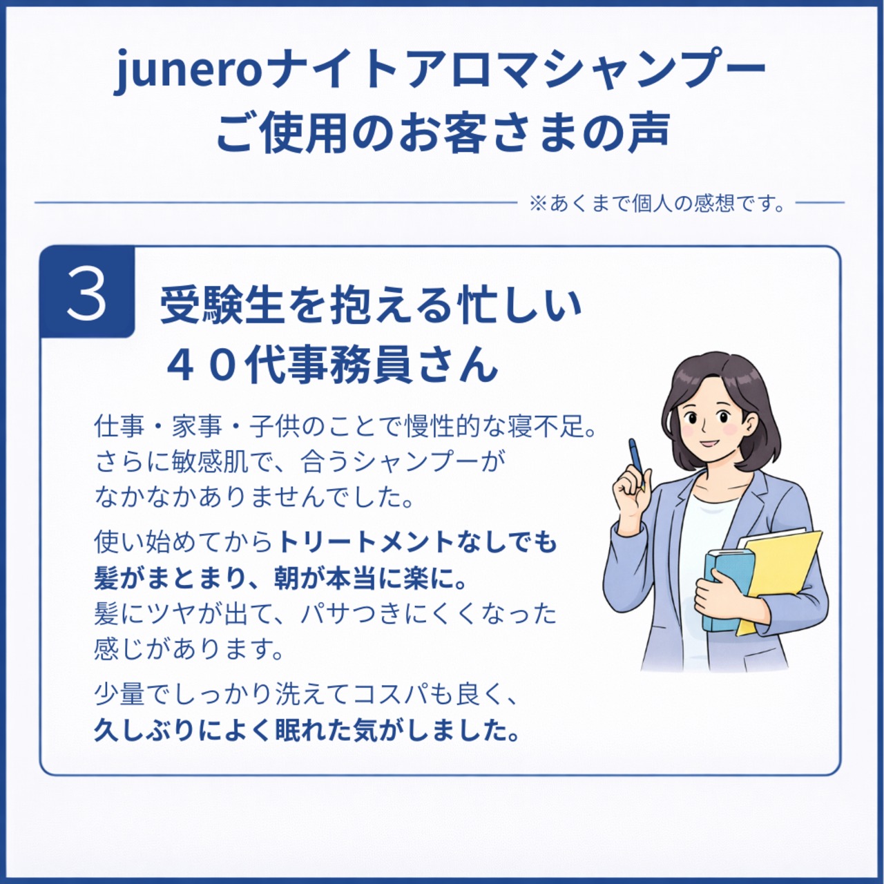 実際に junero のオーガニックシャンプーをお使いいただいているお客様から、たくさんの喜びの声をいただいています。